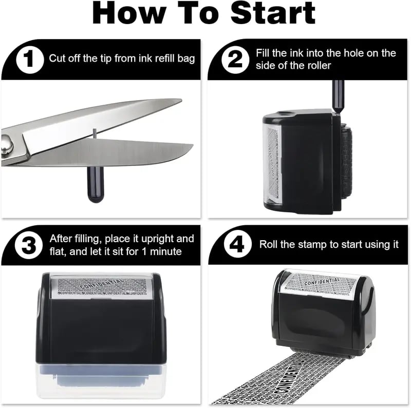 🎁How to Refill the Ink: Comes with 3 ink refills, ink can be refilled in the security protection roller stamp side when ink runs out.